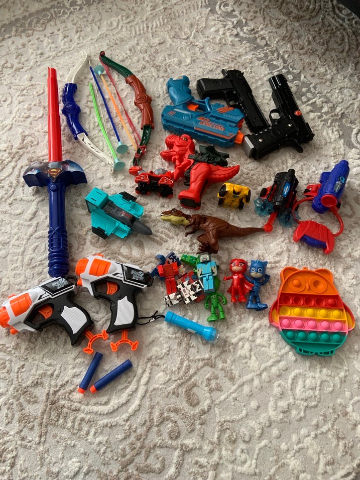 Çeşitli oyuncak silahlar, yaylar, figürler ve renkli pop-it oyuncak içeren oyun seti. Köpük mermiler ve küçük oyuncaklar da dahil.