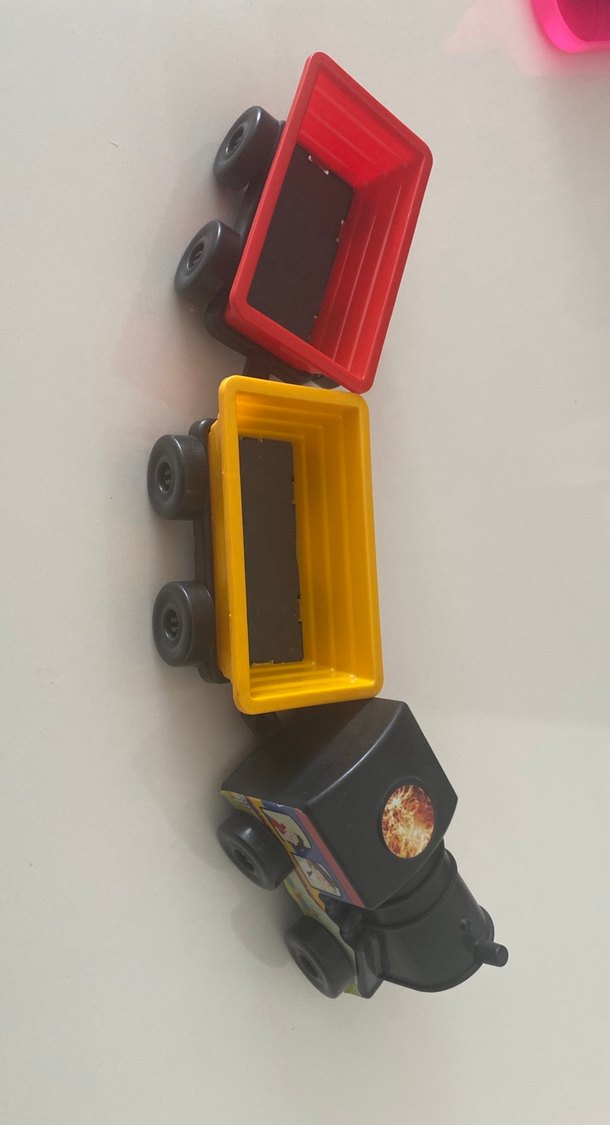 Siyah motor ve kırmızı ile sarı renklerde iki çıkarılabilir yük konteynerinden oluşan çok renkli oyuncak tren seti.