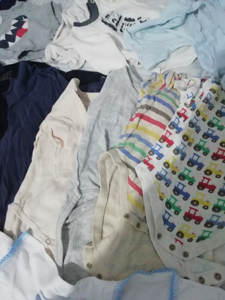 Yumuşak pamuklu, yeni doğan ve 2 yaş aralığında 5 tane uzun diğerleri kısa kollu 25 parça zıbın. 4 5 tanesinde biraz lekelenmeler var çıkabilir ben uğraşamadım. Çoğu yeni gibi