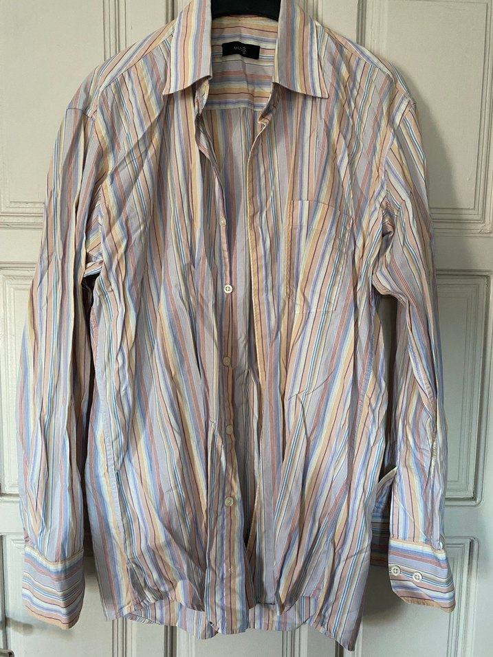Yumuşak keten kumaştan, çok renkli pastel çizgili desenli, uzun kollu, düğmeli, yakalı ve bol kesim erkek gömleği. Ofis ve günlük sokak stili için uygundur.
