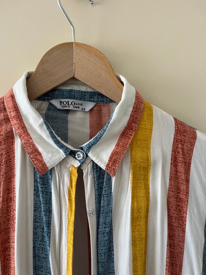 Pamuklu, yakalı, düğmeli ve bol kesim gömlek. En 67cm boy 91cm. Hafif çok renkli batik çizgilerle günlük kullanım için uygun.