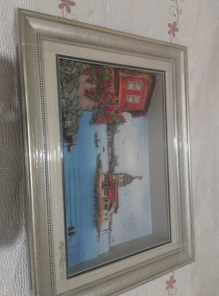 Parlak çok renkli manzara tablosu, detaylı binalar ve sakin su manzarası içerir. Gümüş tonlu çerçeveli.
