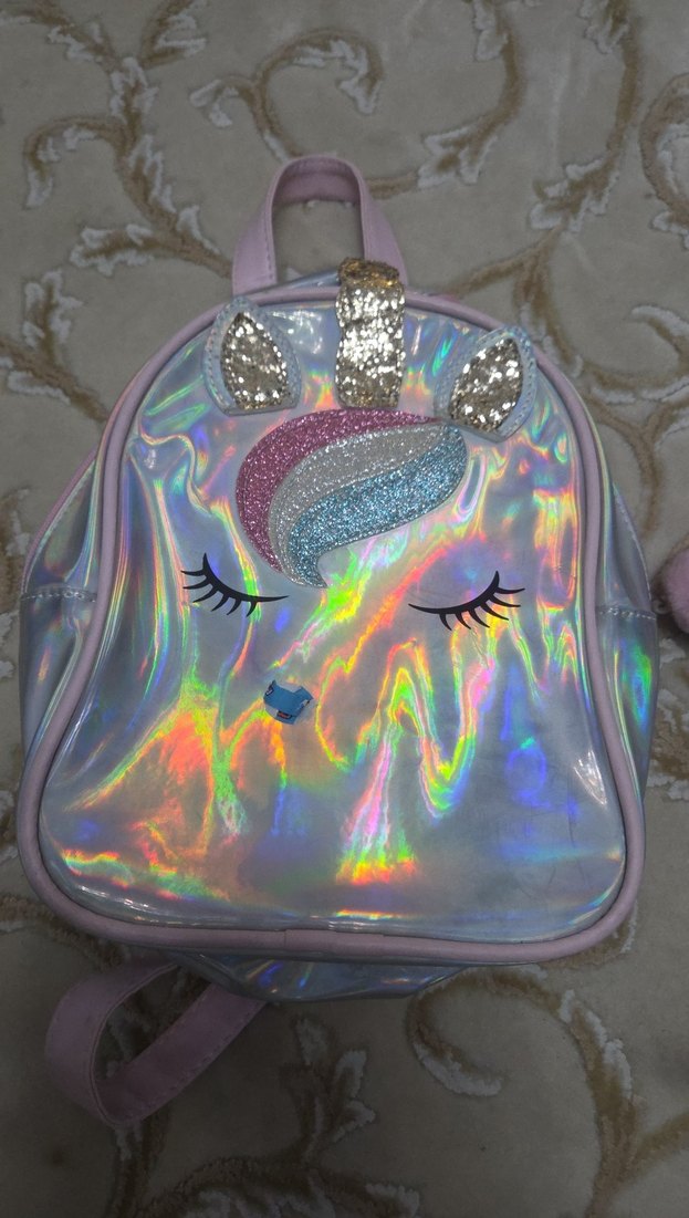 Pastel çok renkli çocuk sırt çantası, parlak unicorn deseni ve simli kulaklar ile tasarlanmıştır.