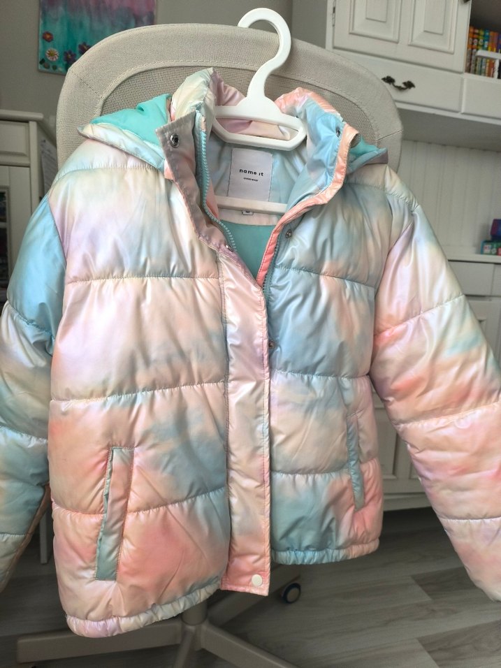 Yumuşak fleece kumaştan, bol kesim ve yakası kesimli, çok renkli pastel bağlama desenli kız mont. Sokak modasına uygun şişme tasarım