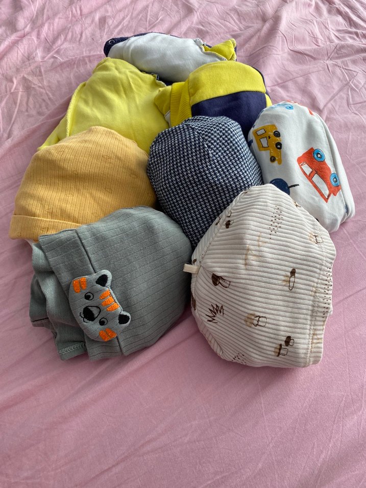 Çeşitli desenlere sahip çok renkli pastel tonlarda, yumuşak kumaştan bebek şapkaları. Toptan verilecek, kullanılabilir durumda, bazıları tek su giyildi, yırtık yok