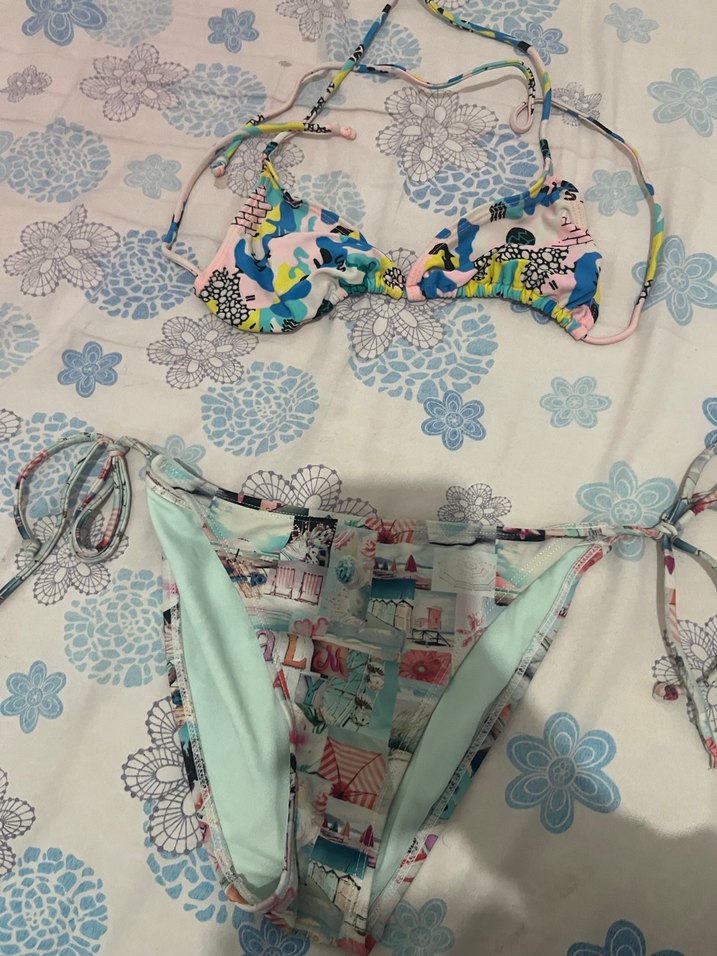 Kadın bikini, pastel çok renkli baskılı, ince askılı ve dantel detaylıdır. Orta boy kesimi ve sıkı oturan yapısıyla plajda şık bir görünüm sunar. ayrı ayrı da satılabilir