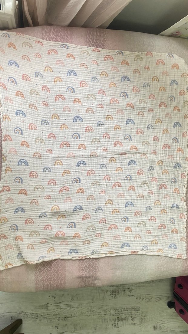 Yumuşak keten kumaştan yapılmış, pastel renklerde çok renkli batik desenli çocuk battaniyesi.