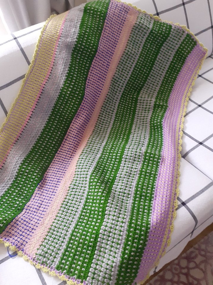 Yumuşak dokulu, yeşil, mor, pembe ve beyaz pastel tonlarda çok renkli çok amaçlı örtü el örgüsübattaniye. Sarı kenarlıklı örme dokusu bulunur.