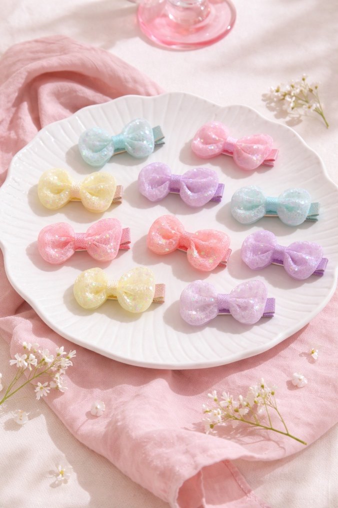 Pastel tonlarda, bağlama desenli fiyonk şeklinde çocuk saç tokaları. Bohem tarzı, yumuşak ve şık bir görünüm sağlar. Adet olarak satışır