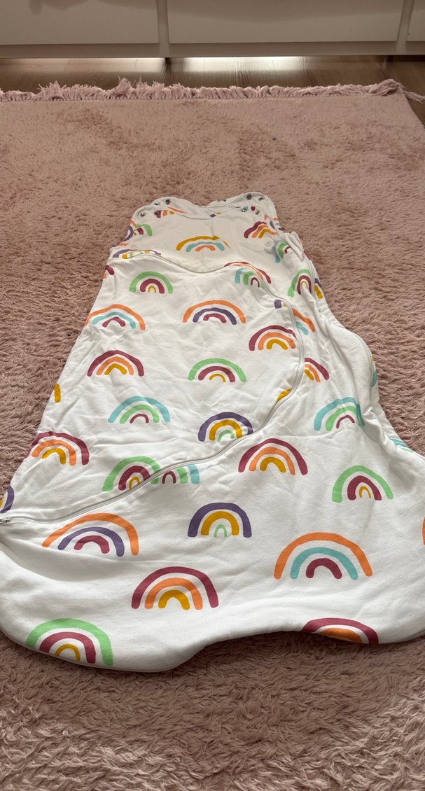 Yumuşak ve rahat kumaştan yapılmış, pastel gökkuşağı desenli bebek uyku tulumu. Pamuklu, 1 tog