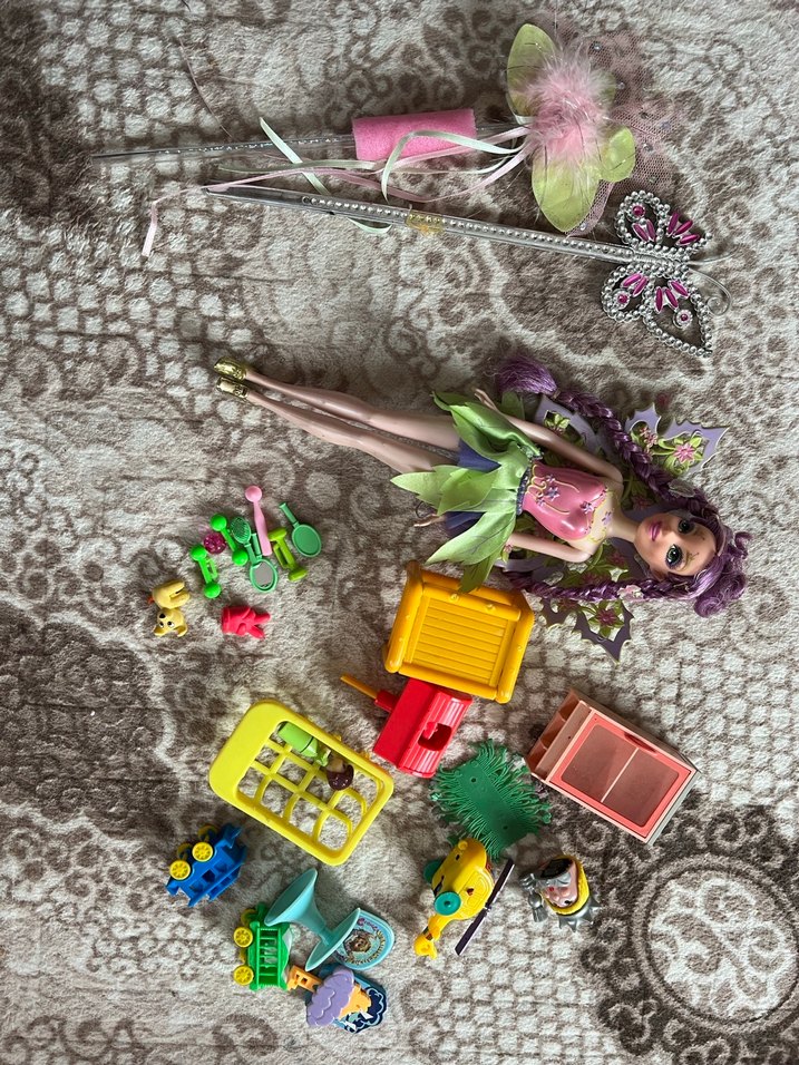 Kanatlı renkli peri bebek ve küçük oyuncaklar, sihirli değnek ve aksesuarlarla birlikte. Hayal gücünü geliştiren eğlenceli set.