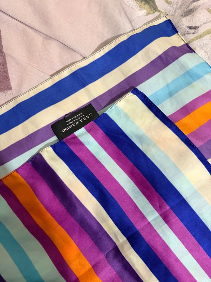 Yumuşak sentetik kumaştan, çok renkli pastel çizgili ve pilili tasarıma sahip bohem kadın fuları.