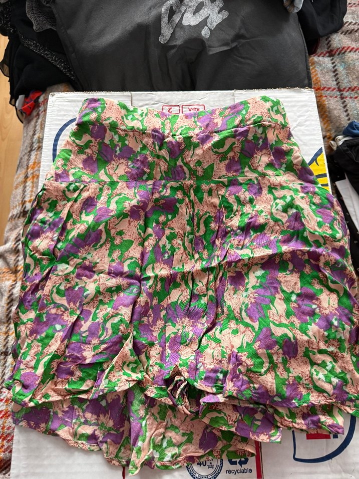 Kızlar için çok renkli, koyu tonlarda tie-dye desenli, pilili ve bol kesim etek. Bohem ve retro tarzda.