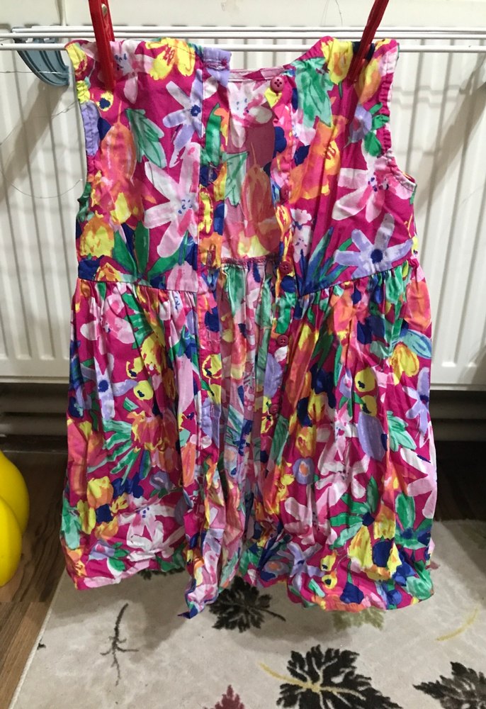 Çok renkli, pilili kumaştan yapılmış bu kız çocuk elbisesi, askısız yaka ve ince askılarla bol kesimdir. Bohem ve retro tarzda bağlama desenlidir.