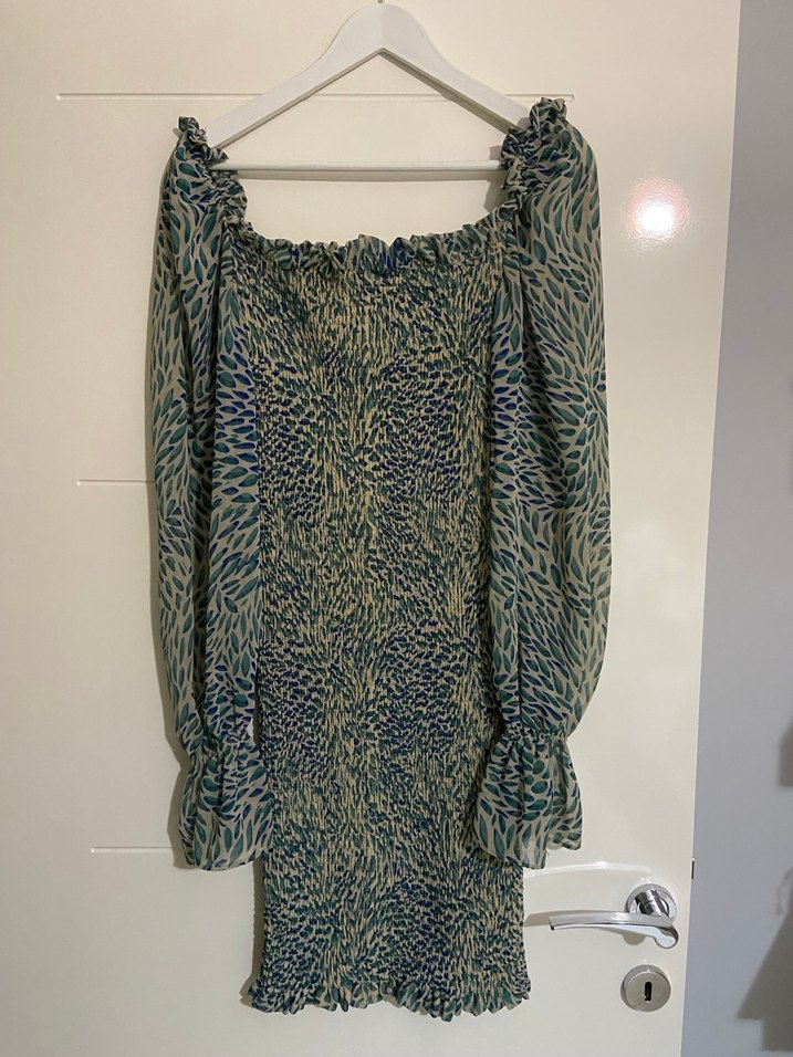 çok renkli, pilili midi elbise. Uzun kollu, tekne yaka ve dar kesimdir. Yumuşak sentetik kumaştan, bohem tarzda, batik desenlidir. 168 boy tam diz üstü duruyor. Moda Çelikler Butik’ten alınmıştır.