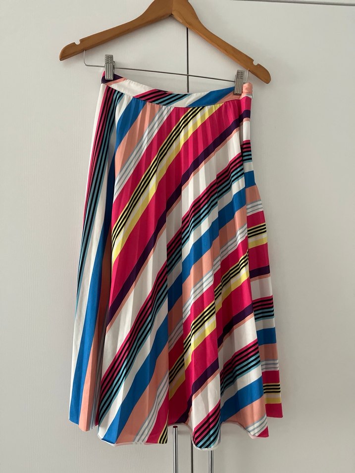 Çok renkli çizgili, pilili detaylara sahip uzun ve bol kesim etek. Yumuşak sentetik kumaştan üretilmiştir, günlük kullanıma uygundur.