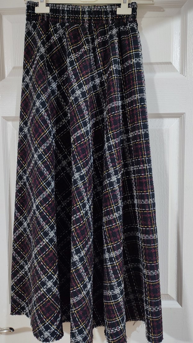 Sentetik kumaştan yapılmış, çok renkli karışık desenli, piliseli ve bol kesim uzun kadın eteği. 40-42 beden, günlük kullanım için uygundur. dikimi bana aittir. bel ölçüsü lastikli hali 66 esnek hali 116 boy 90 cm'dir