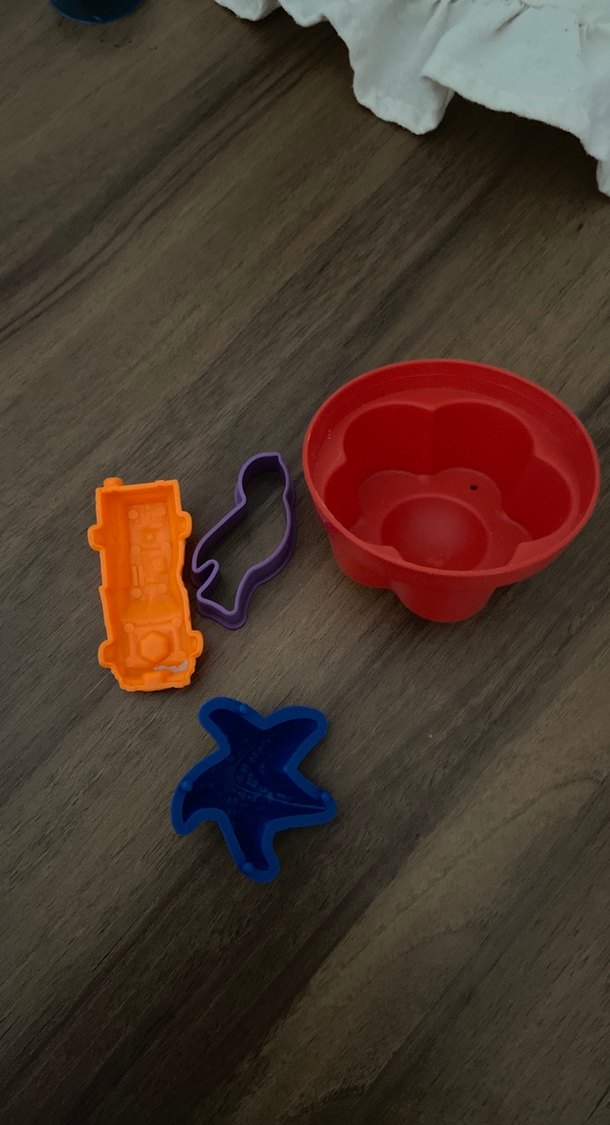 Yıldız, penguen ve araç şeklinde çok renkli plaj ve bahçe oyuncakları seti ile kırmızı çiçek şeklinde kap bulunur.