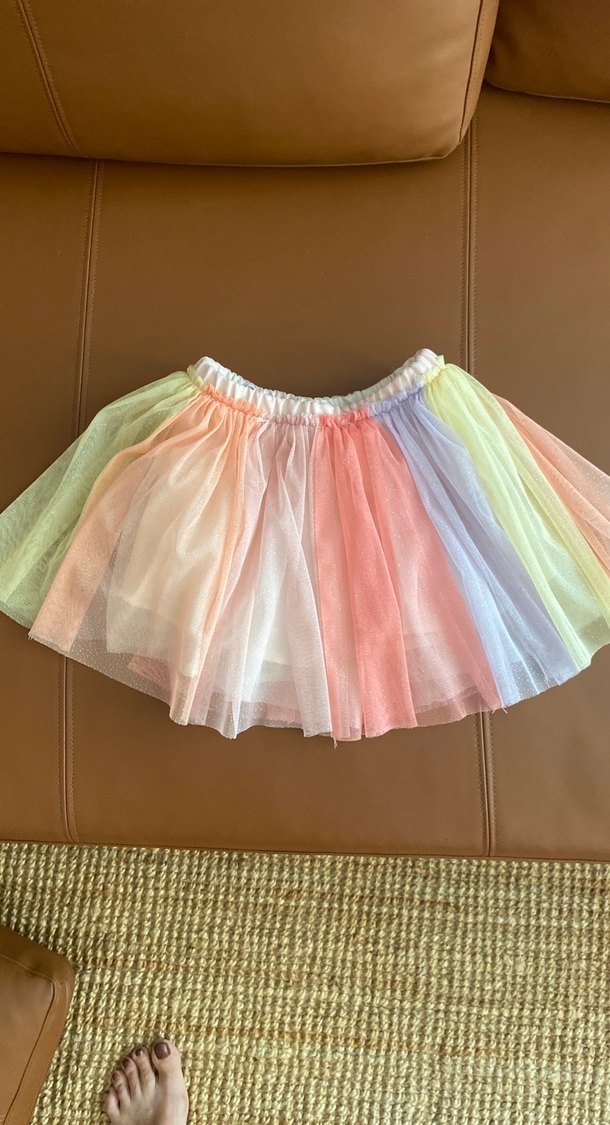 Bu kız eteği, yumuşak sentetik kumaştan yapılmış, bol kesim ve pastel tonlarda tie-dye desenli, fırfır detaylıdır. Bohem ve retro pop kültür stilini yansıtır.