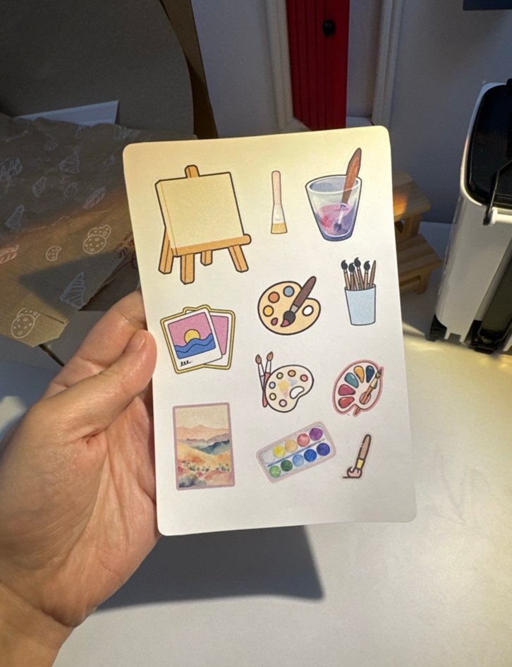 Easel, palet, fırça ve suluboya seti gibi çeşitli resim malzemelerini içeren çok renkli çıkartma seti.