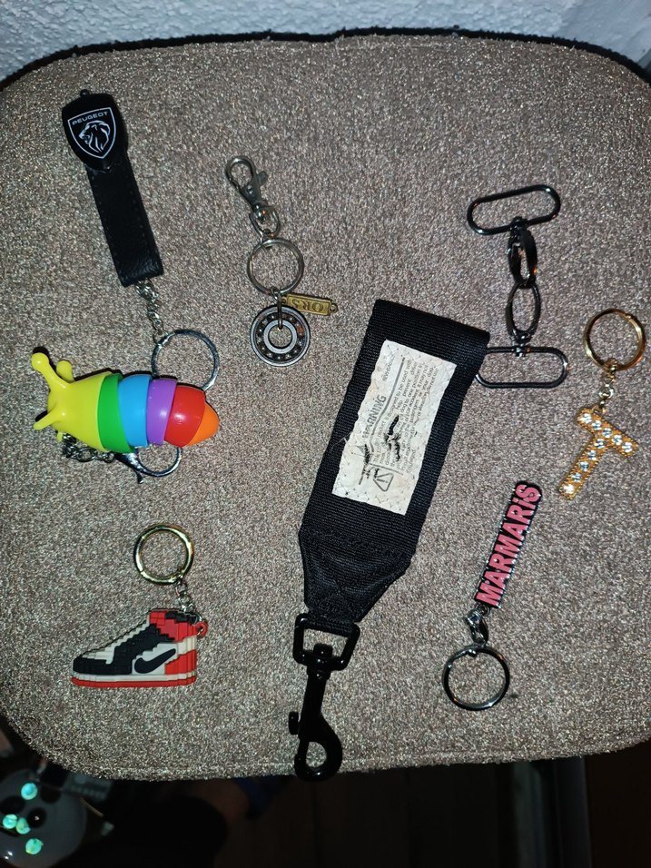 Çok renkli, punk ve grunge esintili tasarımlara sahip anahtarlık seti. Spor ayakkabı, canlı figürler ve marka etiketleri içerir. Anahtarlarınıza asi bir stil katın.