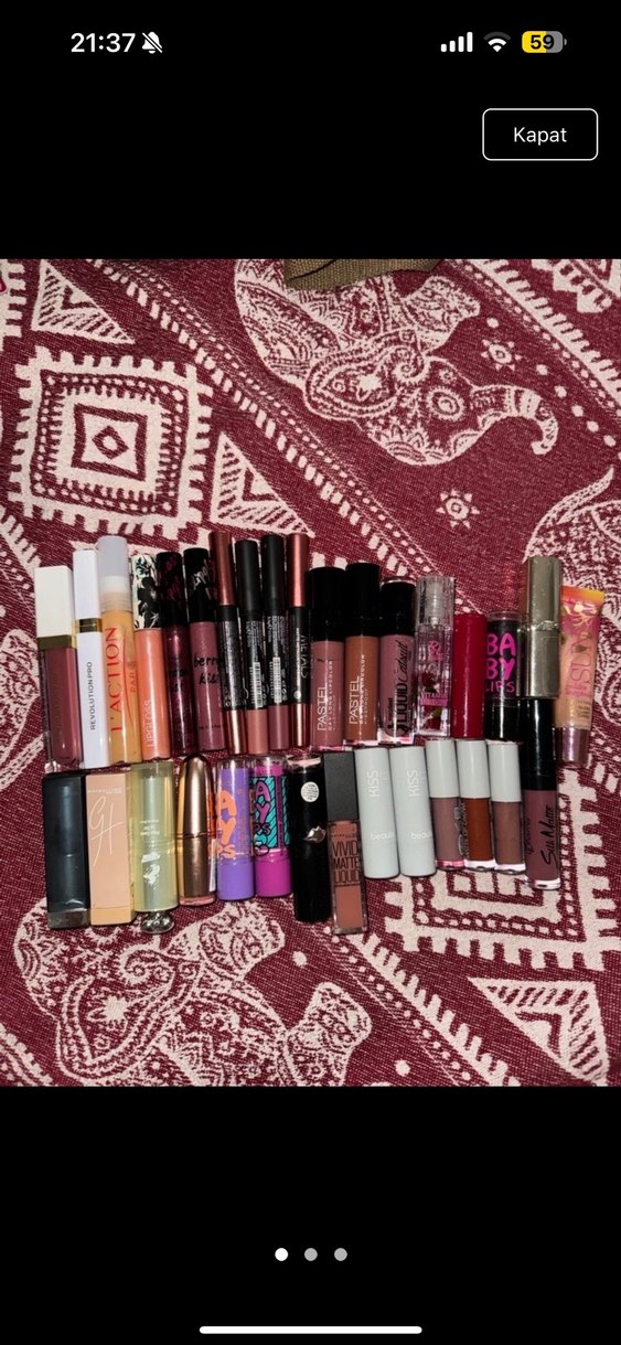 Farklı markalara ait çok renkli tonlarda çeşitli rujlar içeren set. 32 adet hepsinin fiyatı  Revolution pro seduction liquid lip Revolution pro seduction lip setter Laction lip enhancer H&m lipgloss spft coral H&m lipgloss maroon kiss H&m lipgloss berry kiss Golden rose metals matte metallic lip crayon 02 Golden rose matte lipstick crayon 15 Golfen rose matte lipstick crayon 10 Golden rose metals matte metallic lip crayon 03 Pastel 20 Pastel 15 Wetn wild rebel rose R de l young vitamin lip oil Bee beauty cherry kiss Baby lips pink shock Loreal paris 645 Sun lipgloss golden magnolia Maybelline 930 mat Maybelline gg09 Miniso 05 Revolution lipstick inspiration Baby lips peach kiss Baby lips blueberry boom Wetn wild bare it all Maybelline vivid matte liquid 50 nude thrill Beaulis 543 forbidden kiss Beaulis 111 soft kiss Beaulis 01 Beaulis 02 Beaulis 03 Flormar silk matte 11 misty rosy