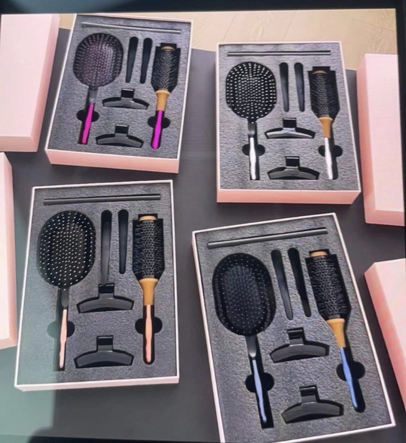 Çok renkli saç şekillendirici seti, yassı fırça, yuvarlak fırça ve saç klipsleri içerir. Canlı koyu tonlarda çeşitli renk seçenekleriyle sunulur. ♀️
