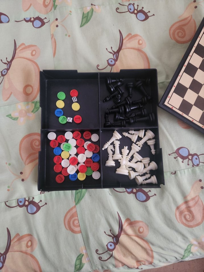Bu oyun seti siyah ve beyaz satranç taşları ile çeşitli oyunlar için çok renkli pullar içerir. Set koyu renk kutuda saklanır. ♟️