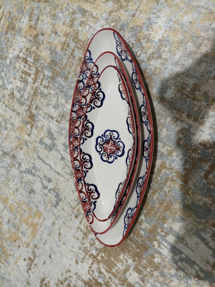 Koyu mavi ve kırmızı desenlere sahip çok renkli seramik tabaklar, yemek servisi için uygundur. ️