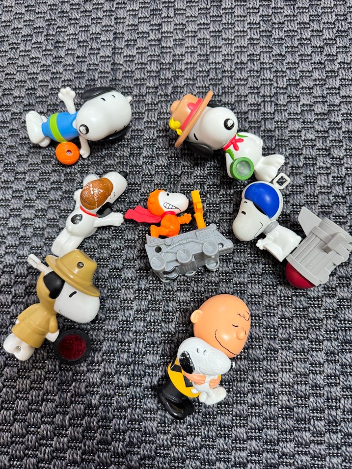 Farklı kostümler ve aksesuarlarla çok renkli Snoopy aksiyon figürleri seti, her biri benzersiz detaylara sahip.