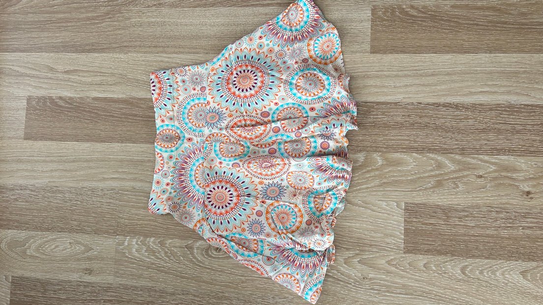 Yumuşak sentetik kumaştan, çok renkli ve açık tonlarda şort etek.