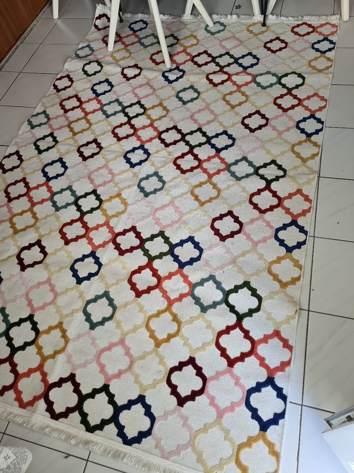 Hafif renkli taban üzerinde çok renkli soyut desenlere sahip, klasik tarzda bir halı. Her odaya canlılık katar.