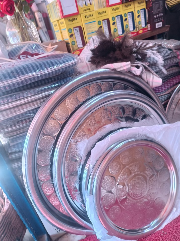 Çok renkli, soyut desenli ve geleneksel tarzda birden fazla tepsi içeren tabak seti. ️