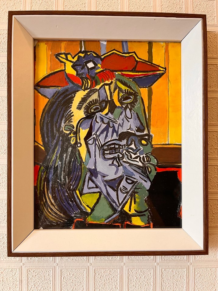 Ahşap çerçeveli, koyu ve çok renkli soyut tablo, cesur ve bozulmuş yüz hatlarıyla dikkat çekiyor. El yapımı akrilik ve karışık boya çeşitleri