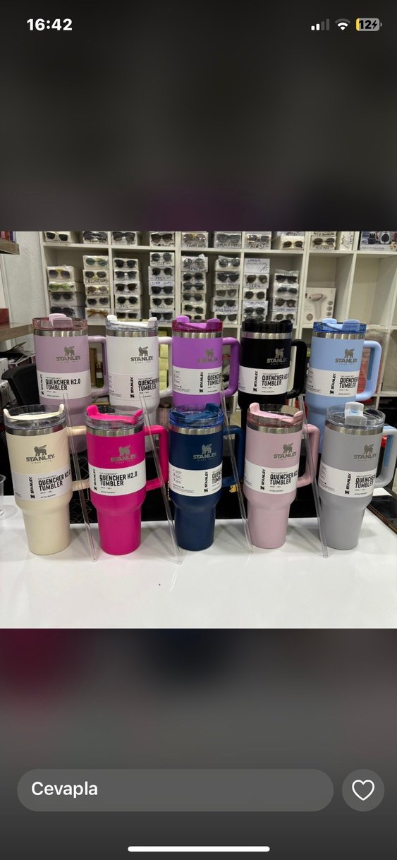 Çeşitli canlı açık renklerde, kapaklı ve saplı çok renkli Stanley termos bardaklar. İçeceklerinizi sıcak veya soğuk tutar. ☕