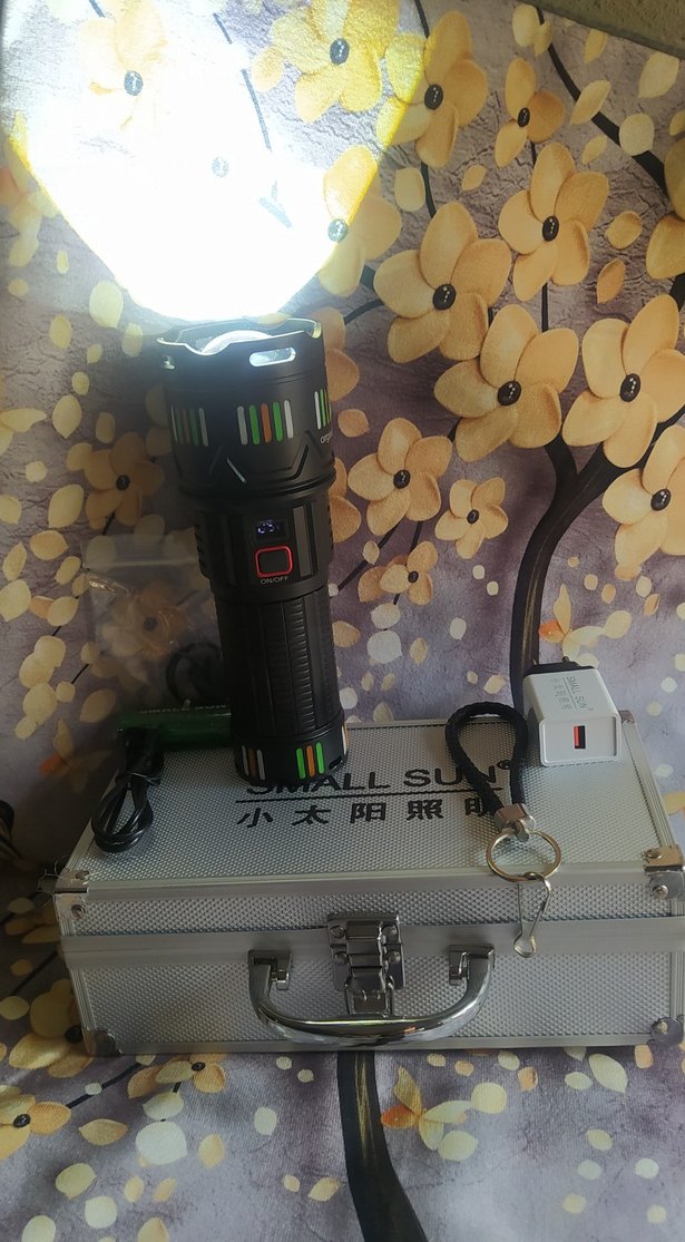 Çok renkli tasarıma sahip taşınabilir LED el feneri, taşıma çantası, şarj cihazı ve anahtarlık ile birlikte sunulur. Parlak ışık sağlar.