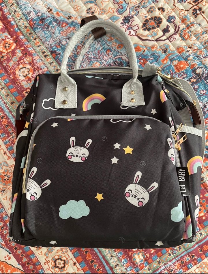 Çok renkli tavşan, yıldız, bulut ve gökkuşağı desenli koyu renkli bebek çantası. Dayanıklı kulplu ve çok bölmeli yanları cepli içi ön cebi termaldir ısıyı soğuğu korur hiç kullanılmadı