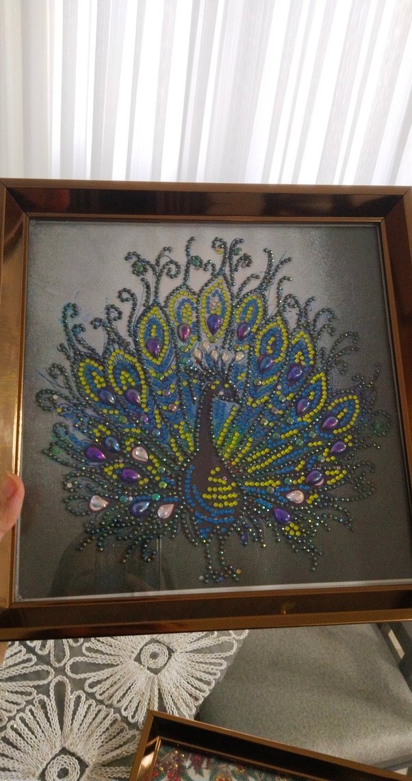 Çerçeveli, çok renkli ve koyu tonlarda tavuskuşu desenli detaylı bir tablo.