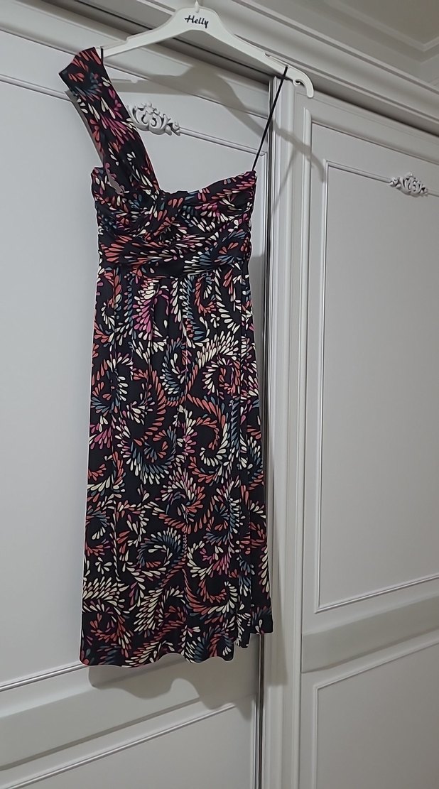 Drapeli ve askılı, çok renkli , orta boy, yumuşak sentetik kumaştan üretilmiştir. Tek omuz elbise dilerseniz straplezde giyilebilir.ya da beline kemer takıp kısa olarak kullanılabilir