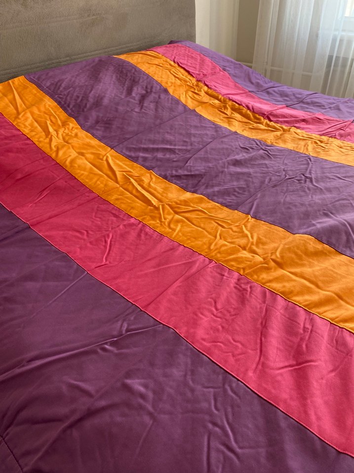 Arasında ince elyaf ve pamuklu astarı var. 165*210 cm ölçülerinde. Bir tane kırlent kılıfı var. Kız çocuk odası için çok uygun. Bir kusuru yok sadece baza altında durduğu için buruşuk