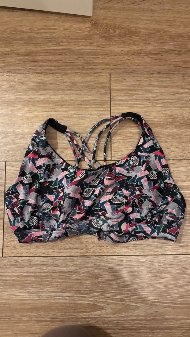 Çok renkli, koyu tie-dye desenli, çapraz ince askılı normal boy spor sütyeni. ️♀️