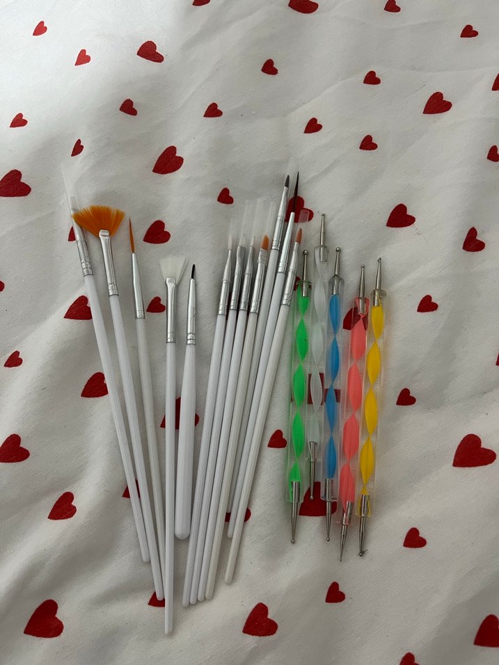 Çeşitli ince fırçalar ve çok renkli saplı noktalama aletleri içeren tırnak süsleme seti. French için silikon alet. Hiç kullanılmadı pazarlık yapılır .