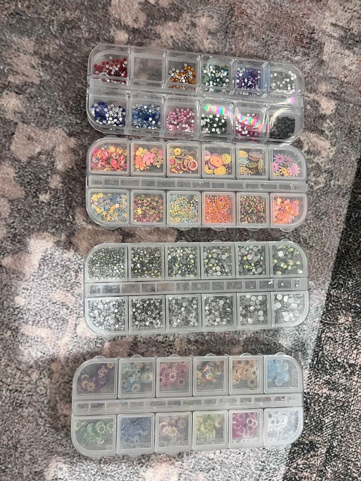 Farklı şekil ve boyutlarda çok renkli tırnak süsleri, şeffaf bölmelerde düzenlenmiş.