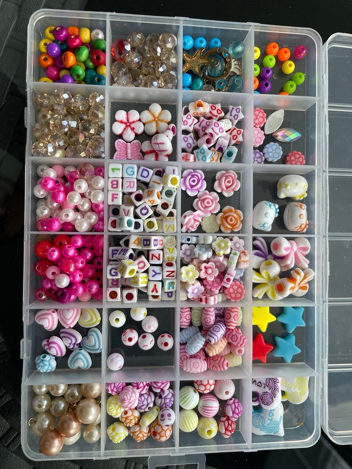 Farklı renklerde boncuklar, çiçekler, yıldızlar ve harf blokları içeren bölmeli tırnak süsleme seti.