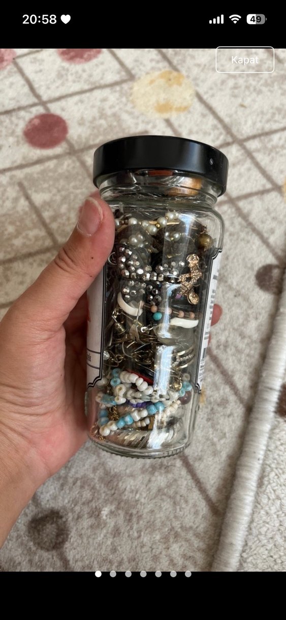 Çok renkli ve koyu tonlarda boncuklar ile küçük tırnak süslemeleri içeren kavanoz.