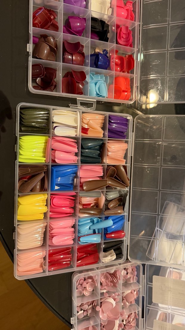Çok renkli, koyu tonlarda tırnak süslemeleri, bölmeli kutuda düzenlenmiş. Yaratıcı tırnak tasarımları için uygundur.
