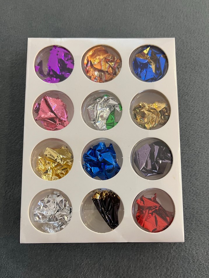 Koyu ve çok renkli parlak tırnak süslemeleri seti, tırnaklarınıza parlaklık ve doku katar.