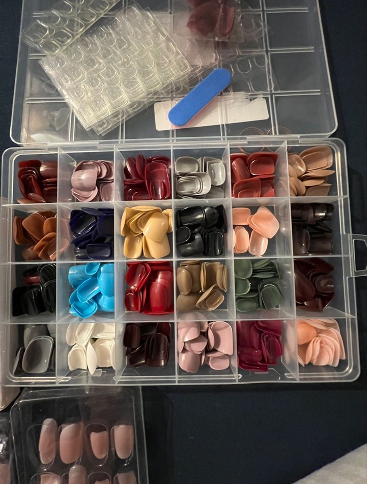 Farklı koyu ve canlı renklere sahip çok renkli tırnak süsleri seti, bölmeli kutuda ve tırnak törpüsü dahil.