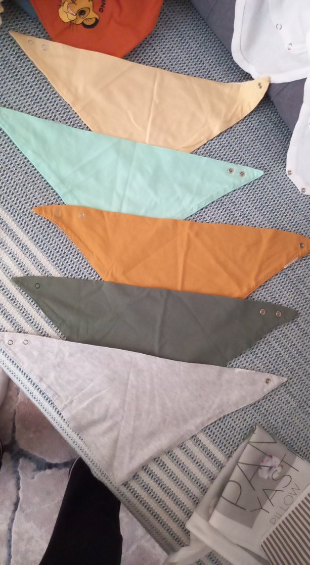 Çok renkli, çıtçıtlı üçgen bebek önlükleri, yumuşak kumaştan üretilmiştir. Pastel ve nötr tonlarda mevcuttur. çok tarz katıyor çocuklara