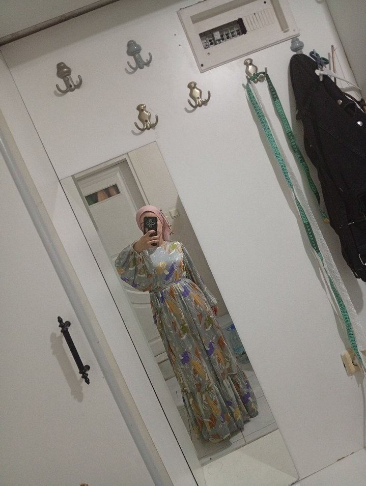 Çok renkli, uzun ve bol kesim bohem elbise. Yüksek yakalı, uzun kollu, balon kol, bilek kısmı lastikli, renkli desene sahip hafif saten kumaştan yapılmıştır.
